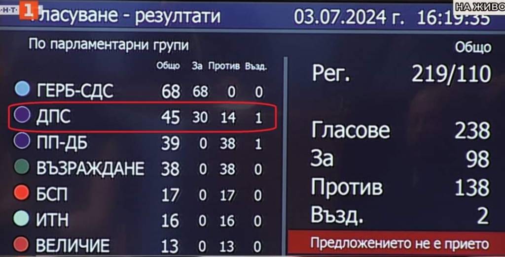 Вотът на ДПС за правителството, предложено от ГЕРБ, се р а з ц е п и – цели 14 души гласуваха “против” и един – “въздържал се”.
