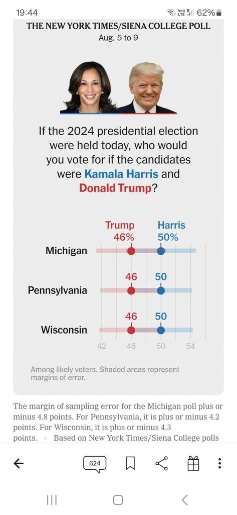 Проучванията са първите анкети с високо качество в тези щати от момента, в който г-н Байдън обяви, че се отказва от участие в надпреварата. Те се появяват след цяла година, през която проучванията индикираха или равенство в битката, или малка преднина за г-н Тръмп.”