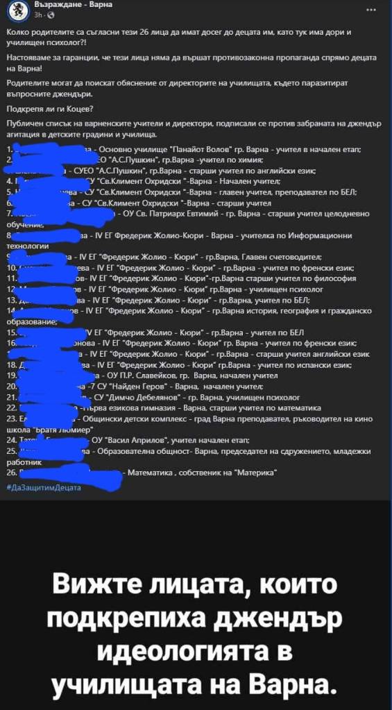 Току-що получих информация, че активисти от местната организация на “Възраждане” във Варна публично з а п л а ш в а т част от 460-те преподаватели (онези, които работят на територията на Варна), подписали петицията срещу новия закон срещу “пропагандата на нетрадиционни сексуални практики в българските училища”.